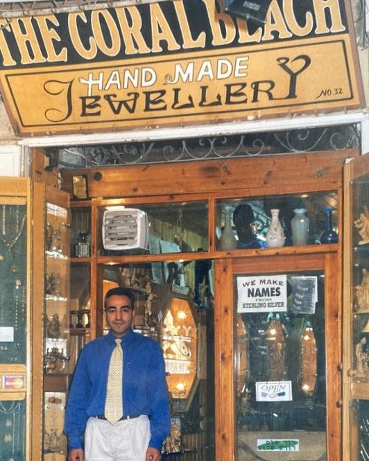 Curious about the beach's name, I discovered it was called The Coral Beach. This encounter left an indelible mark on me, inspiring the name for my jewelry business. Today, while our new sign proudly adorns our storefront, the original from 1987 remains a cherished relic atop our roof, preserving the legacy of our journey." - Ibrahim Bader